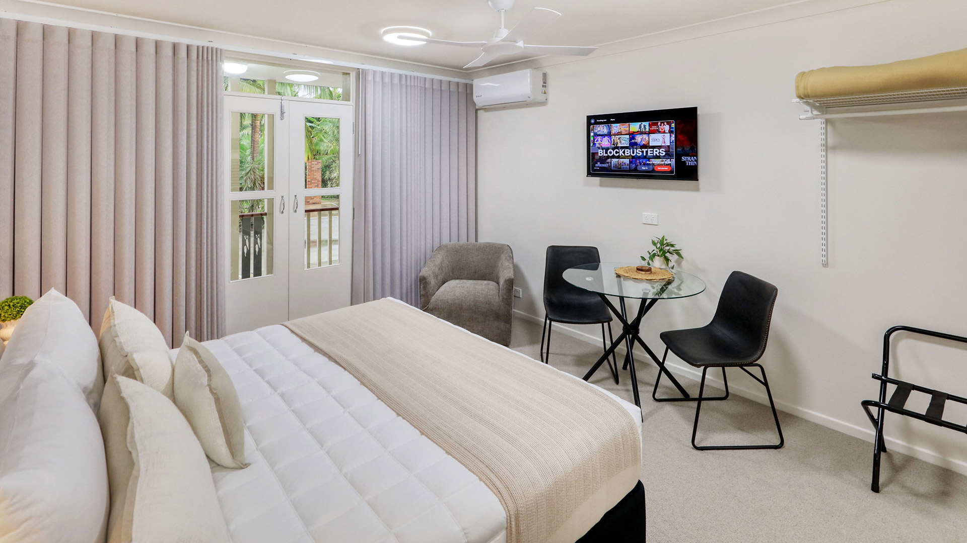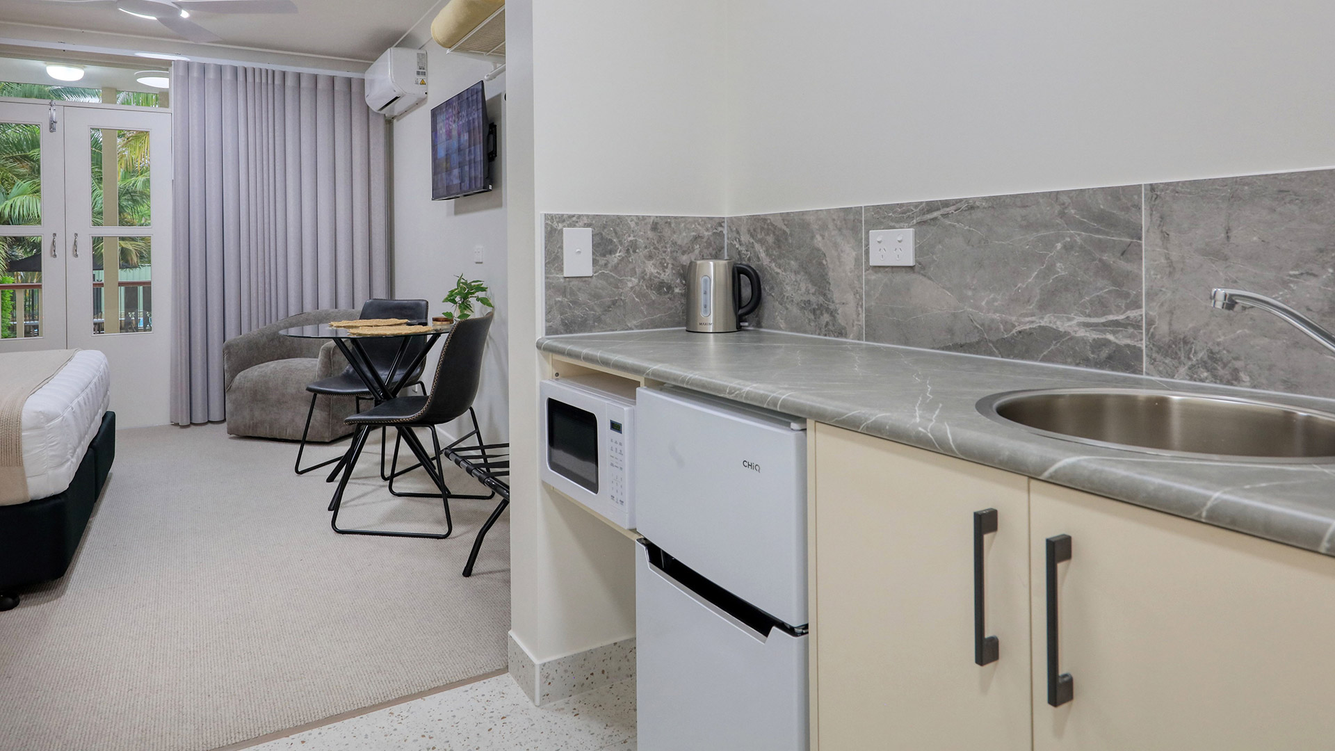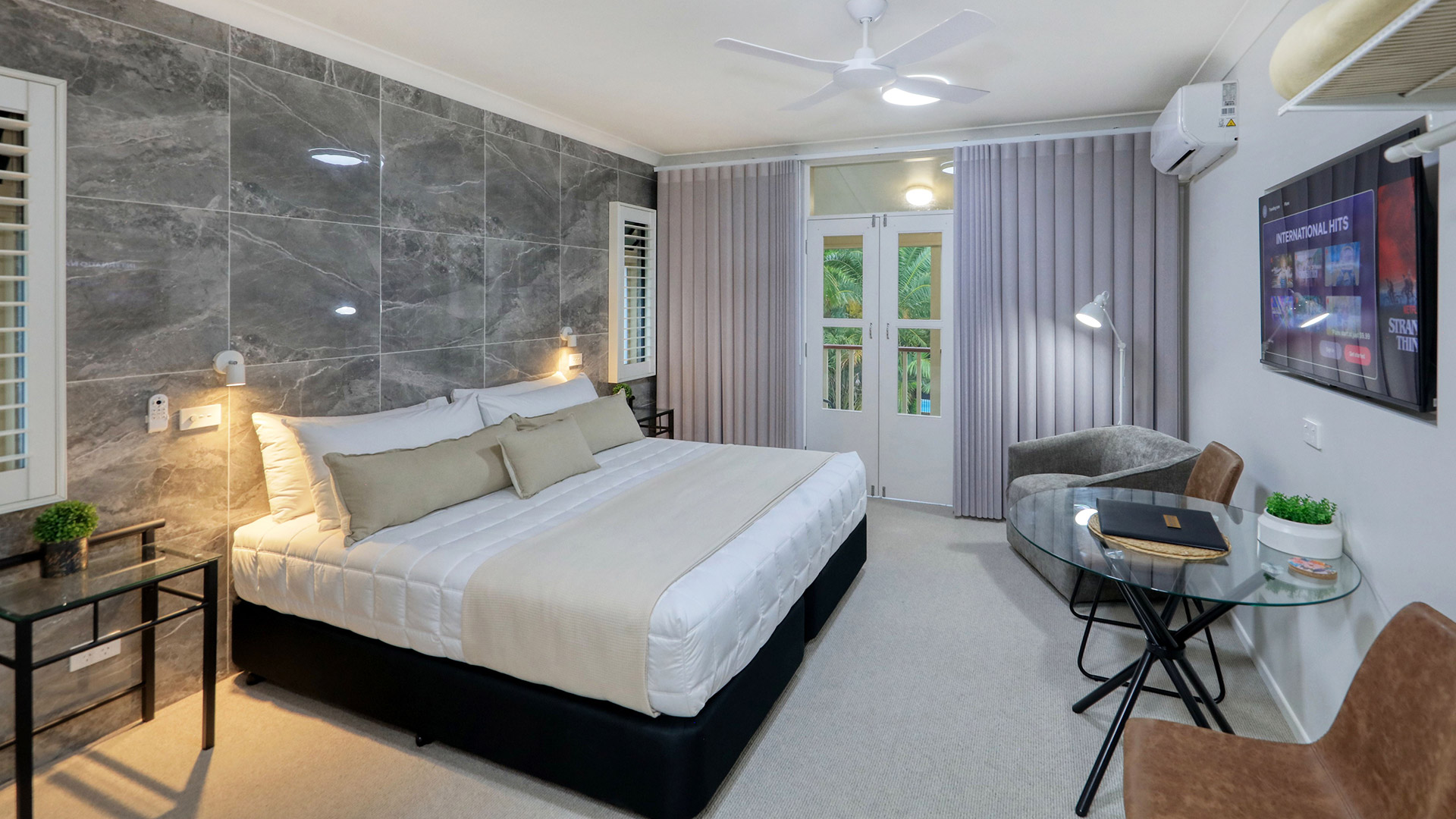 The BEST room in Town!!! Overlooking the pool area, our brand new Deluxe King Rooms offer a full sized king bed and are luxuriously appointed to meet the most discerning of guests. Each room offers air con, tea and coffee making facilities, with kitchen sink, microwave, a wall mounted television,and ironing facilities.