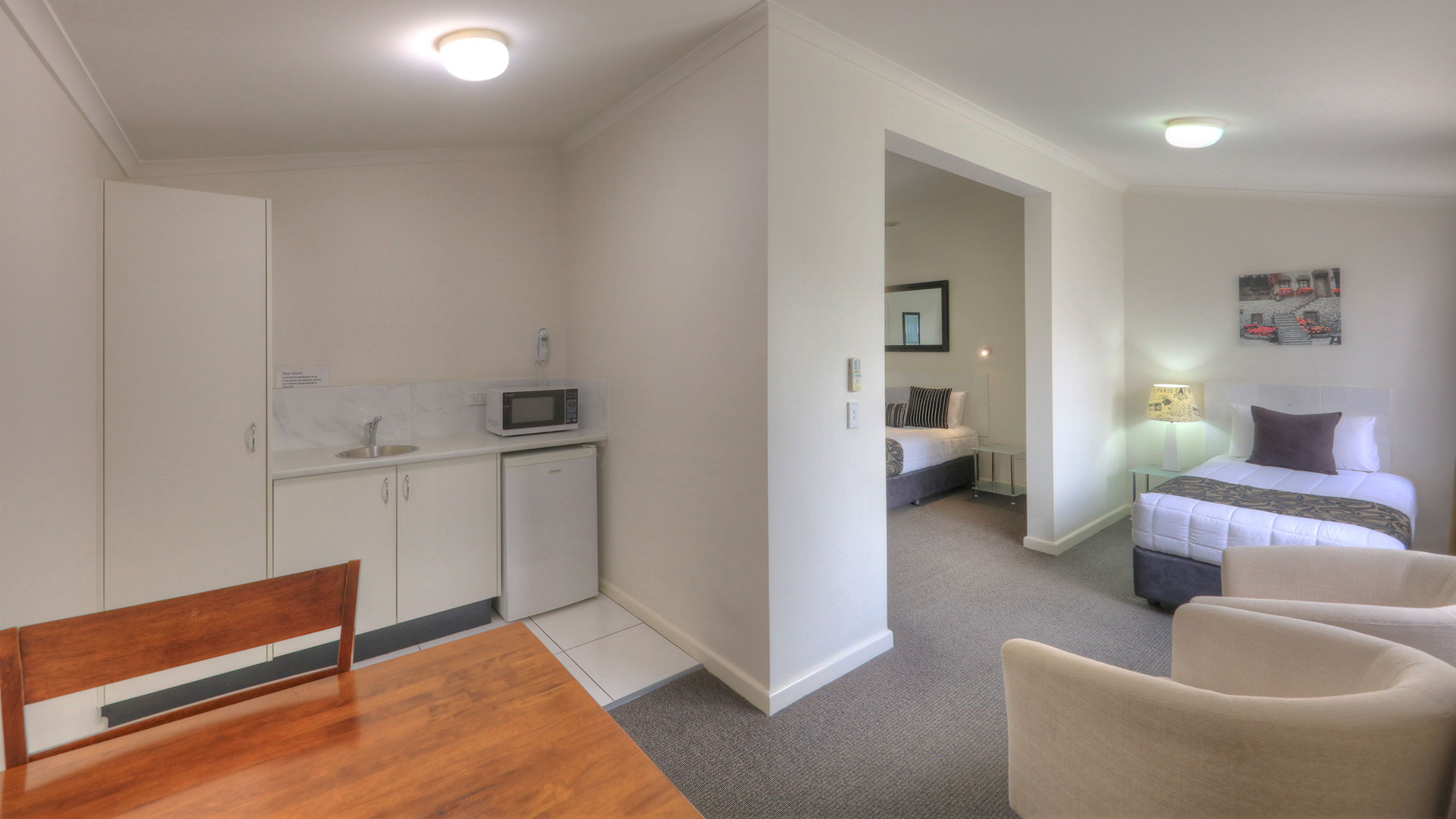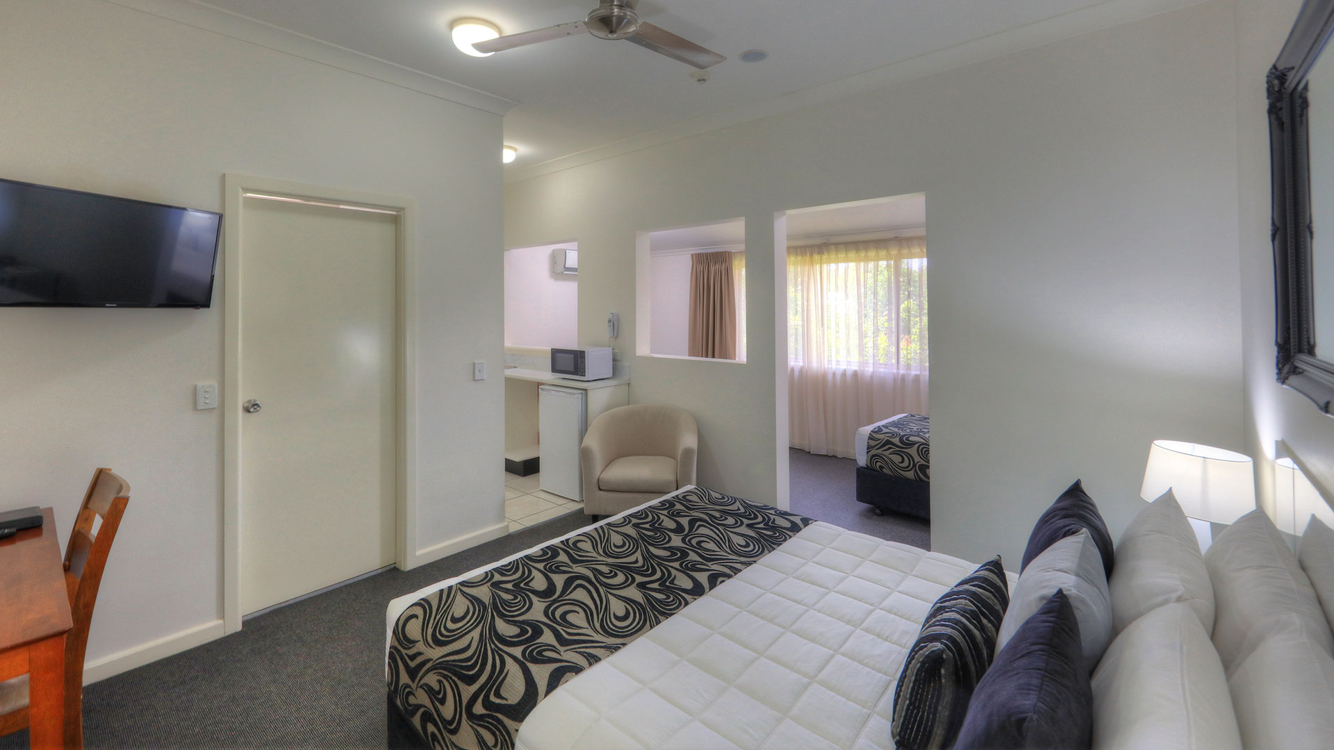 At Heritage River Motor Inn, all our rooms have air con, tea and coffee making facilities, with kitchen sink, microwave, queen and single bed or a queen bed only. Each room has a wall mounted television, and ironing facilities.