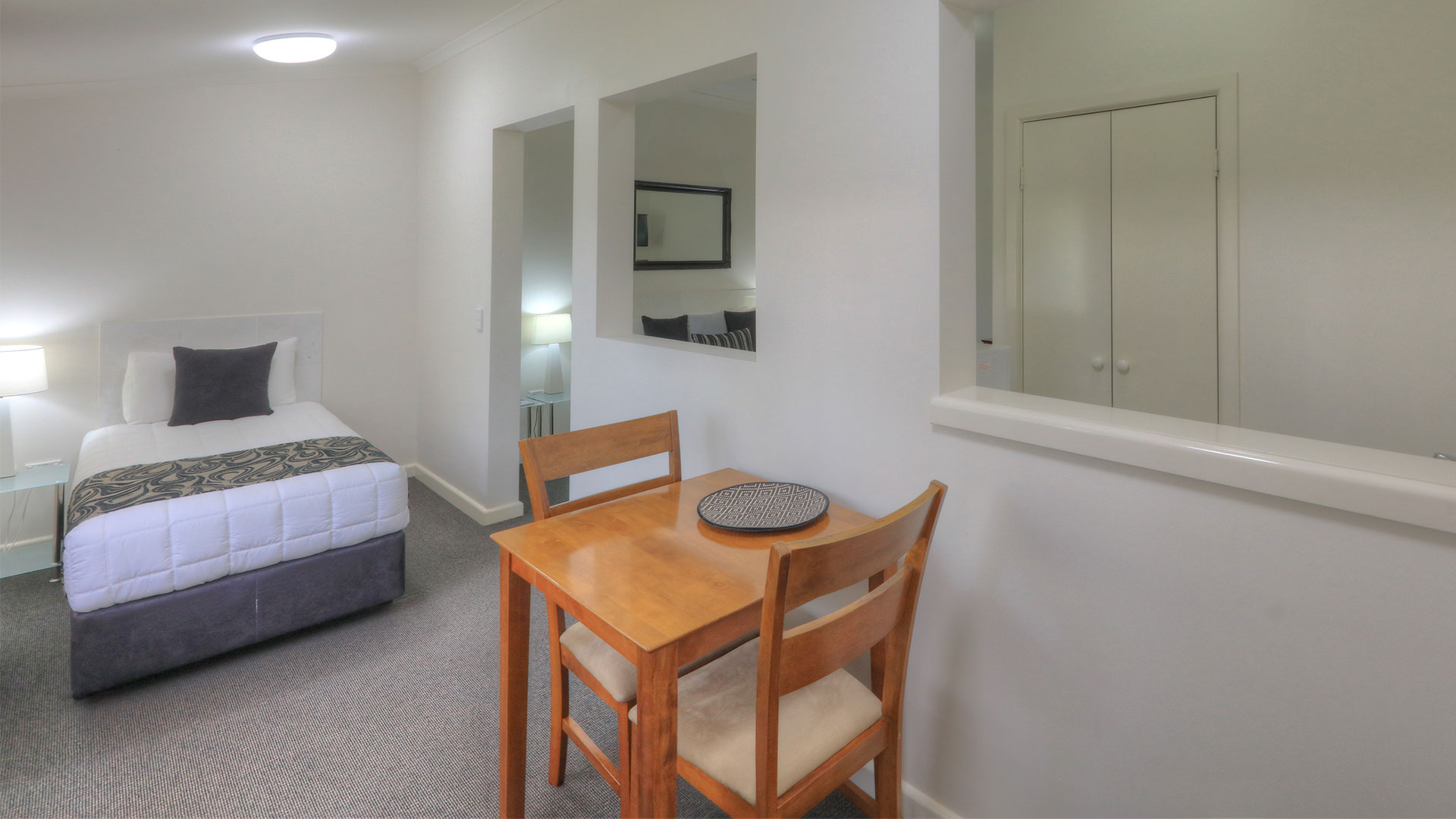 Designed for the comfort of the disabled and carers, our Executive Queen Access rooms offer spacious smoke free rooms with 1 queen and 1 single bed. A half wall between the beds offers the ultimate comfort and privacy. Wall mounted TV, air con, tea and coffee making facilities and fresh milk provided. Secure off street parking, very quiet rooms. We have 2 Access rooms and they both comply with all regulated facilities .