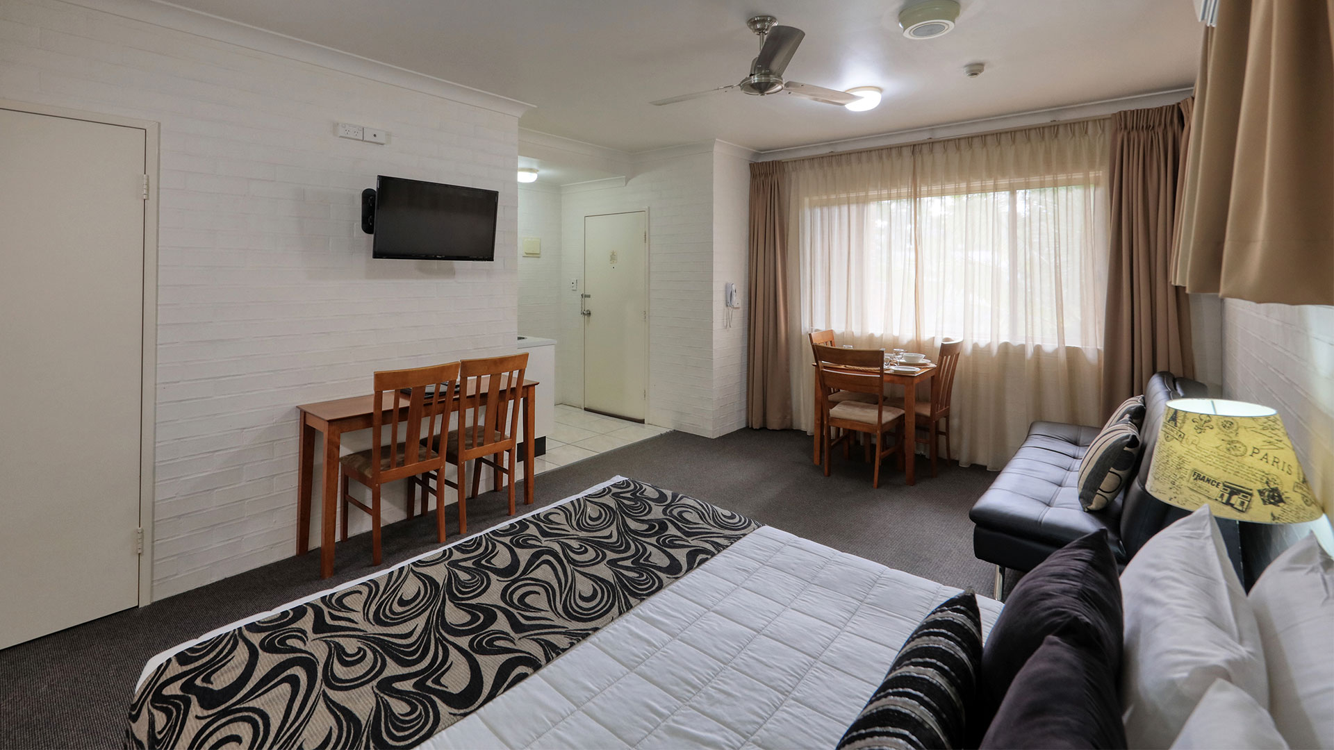 Family Rooms. Spacious and smoke free. Our family rooms are 2 bedrooms, with veranda's, and out door seating, to relax and enjoy the afternoon breeze, or just sit and read a book beside our pool and listen to the birds. Room configurations . 1 queen bed, 4 single beds, sleeps 6 people. This room also has a sofa for watching TV. Our other 2 bedroom family room has 2 queen beds, and 2 single beds sleeping 6 people.